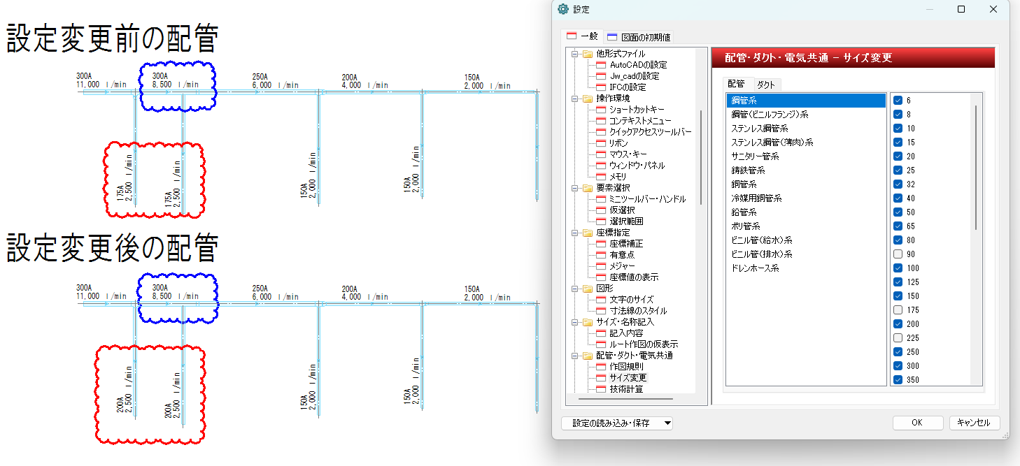 Q【配管・ダクト・電気共通-サイズ変更】使用する配管サイズを設定するには?
