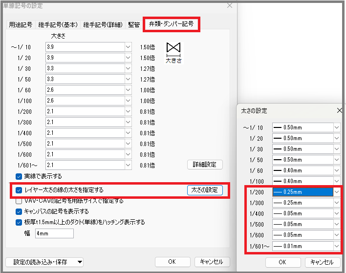 Q【単線記号の設定】ー【弁類・ダンパー記号】配管・ダクトの太さと記号の太さを別々にするには?