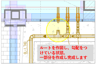 小口径枡を入れす、ルートを作図し、勾配を付けます。枝を接続せず桝を配置します