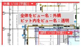 外構図にピット内の配管を非表示にします。全体をビュー名:外構で全体を表示し、ピット内をビュー名:透明で表示します。透明のビューのレイヤーを非表示にします。