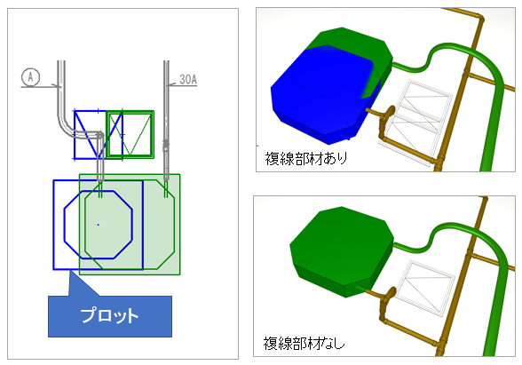 プロットは複線部材無しで配置 施工図とプロットの担当が分かれている場合、プロットを3次元で作成すると重なりあってわかりにくい状況になる時があるのでプロットは2次元で配置し、施工図で3次元器具を移動します。
