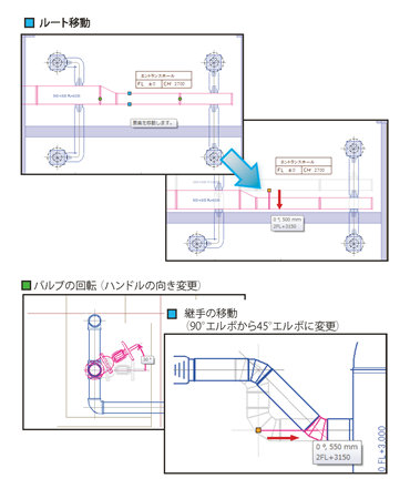 施工図では、配管・ダクトのルート調整や納まりの検討が多く、編集操作の比率が高くなります。ハンドル機能により、これらの操作がスムーズに行えるため、作業効率が向上します。