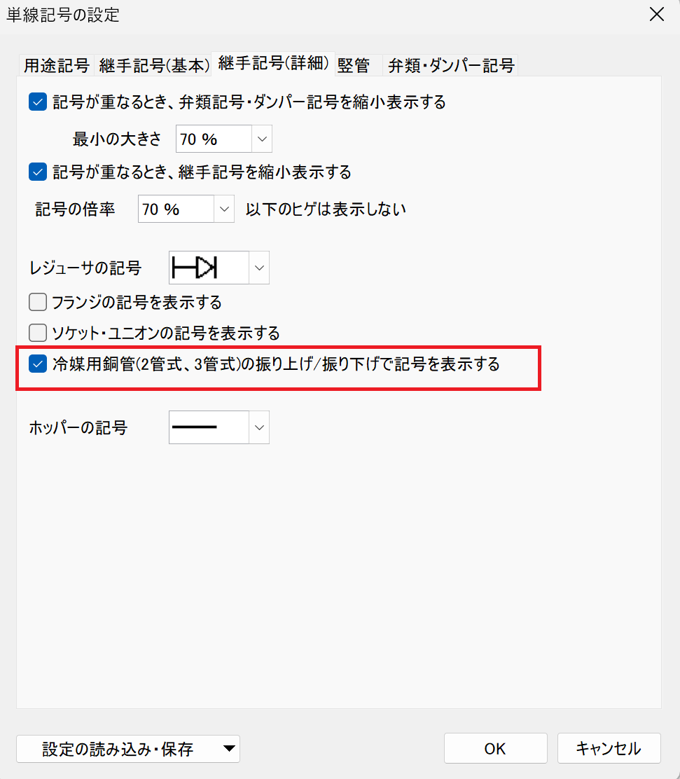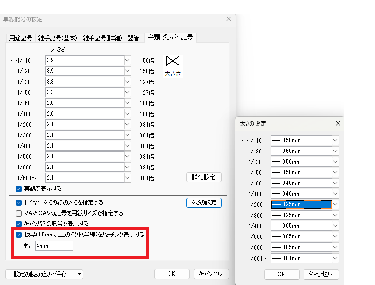 Q【単線記号の設定】ー【弁類・ダンパー記号】配管・ダクトの太さと記号の太さを別々にするには?