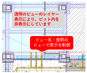 外構図にピット内の配管を非表示にします。全体をビュー名:外構で全体を表示し、ピット内をビュー名:透明で表示します。透明のビューのレイヤーを非表示にします。
