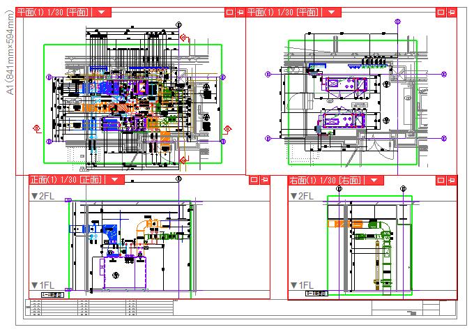 図面に表現されないレイアウト作成は、2ステップで作成出来るため時間短縮できます。また、自由自在に出来るため、ダクト図・配管図・衛生詳細図など、図面名ごとに、枚数・大きさを自由自在でレイアウトを作成します。モデル空間⇔ペーパー空間の区分が無いため、どのレイアウトからも作図・修正が可能のため、修正図での効率もよくチェックバックの修正も出図レイアウトで編集ができるため担当者が変わっても作業がスムーズに行うことができます。